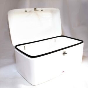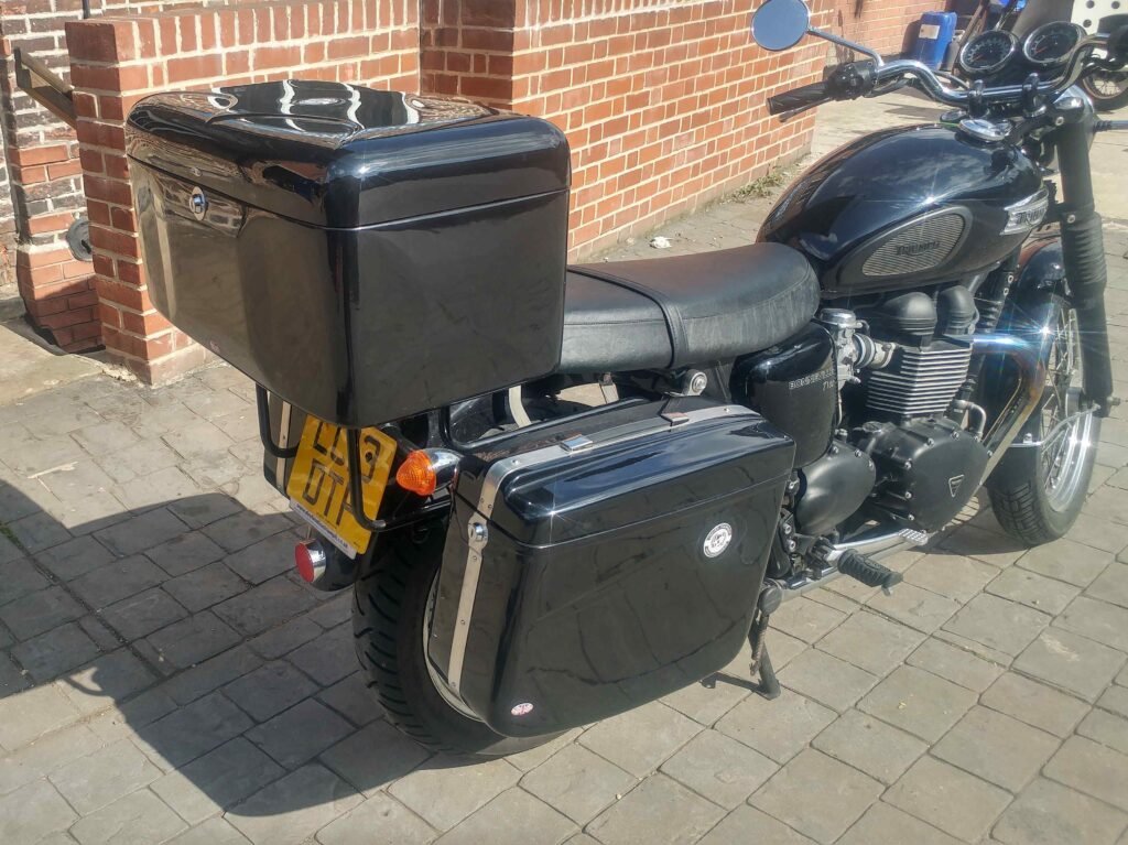 The Atlas is a very large topbox that can hold two full face helmets. Despite being our largest topbox, it is as strong as all our other luggage and is still narrower than two panniers attached to a motorcycle so it will not affect riding. The Atlas has a scalloped lid with stainless steel hinges complete with stop and our secure lock. If you are looking for luggage that holds everything (including the kitchen sink) then this is the topbox for you. Our catalogue picture shows the Atlas fitted to a Triumph T100, with Comet panniers attached underneath. Even though the Atlas hangs over the rack, the panniers are still able to open with ease. Compare the width of the Atlas to your handlebars to get an idea of how it would sit on your bike! If purchasing topboxes with panniers then all 3 locks will use the same key so you don’t need one for each piece. All of our topboxes come complete with fittings required to attach them to our tubular rack.